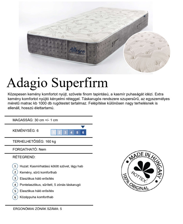 A Rottex Allegro Adagio GT Super Firm táskarugós matrac extra kemény komfortot és megbízható alátámasztást kínál mindazok számára, akik egy igazán kemény, magas teherbírású matracot keresnek. Az innovatív GELAX technológiával ellátott felső réteg extra kényelmet biztosít, miközben a matrac 30 cm-es vastagsága és a szuper-sűrű, 5 zónás táskarugós rendszer optimális testtámogatást nyújt.