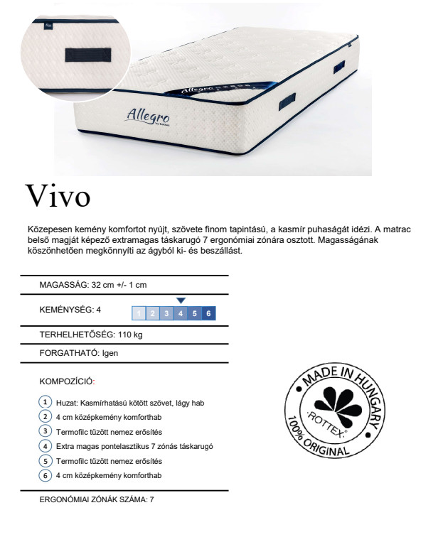The Rottex Allegro Vivo is a 32 cm tall, medium-firm, 7-zone pocket spring mattress.