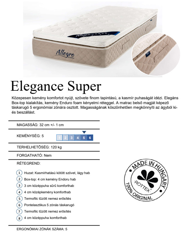 Az Allegro Elegance Super matrac az Allegro táskarugós matraccsalád kiemelkedő darabja, amely 32 cm vastagságával és luxus kialakításával az Allegro matracok csúcsmodellje.