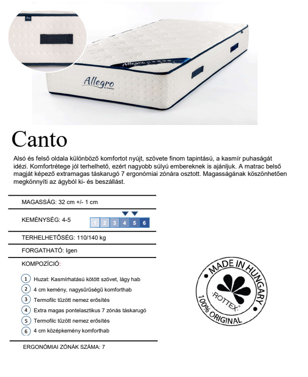 The Rottex Allegro Canto is a 32 cm tall, medium-firm, firm, 7-zone pocket spring mattress with two different sides.